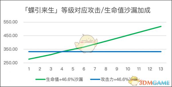 还是以上文的条件(胡桃+护摩之杖)来看,归纳整理后可以得到下表的参考数值,即使有13级技能和精炼5的护摩之杖,仍需要圣遗物副词缀提供39.5%的生命值加成,相当于除开生命值沙漏外,还需要其余4个部位每个部位副词缀刷到两次百分比生命值。因此堆满「蝶引来生」的攻击力加成在当前版本无疑是得不偿失的,但「蝶引来生」的天赋等级越高越好是毋庸置疑的。