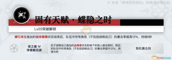 罕见的提供暴击率加成的技能,仅看「蝶隐之时」的加成,虽然数值上不如双冰共鸣,但生效条件更易、加成对象更广,因此实用性上强了不少。岩主的元素爆发在解锁命之座I之后虽然也有提供给队友的暴击率加成,但数值低于胡桃不说,生效条件也更为苛刻。因此胡桃目前可以稳坐暴击拐头把交椅。
