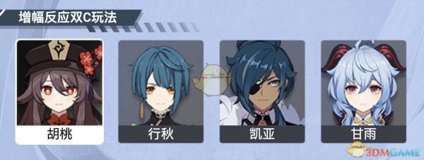 行秋及凯亚的脱手型元素爆发可以保证胡桃在普攻→重击循环输出时普攻吃到蒸发,重击吃到双冰共鸣及融化(若水元素未被冻结反应完仍可触发匣里灭辰增伤效果)。第四位角色带甘雨可以保证胡桃的输出真空期不会浪费暴击率buff及输出时间(配合血梅香延时dot机制打融化)。其中凯亚解锁二命即可,若解锁六命更佳,沙漏需要带充能保证输出循环。