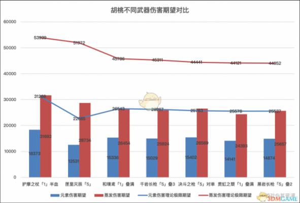 图中柱形图部分为较易达到的伤害期望(倍率100%),折线图部分为理论极限伤害期望(倍率100%)。由于在计算期望时没有侧重元素精通,因此蒸发伤害较为稳定。从图中我们可以看到:护摩之杖在各方面都拥有压倒性的优势,而以蒸发、融化玩法为主的玩家可以选择「匣里灭辰」;除两者外,「和璞鸢」由于精炼要求较低,武器技能触发便利,更适合没有护摩的玩家选择;其后便是「决斗之枪」「千岩长枪」「黑岩长枪」,三者触发条件都比较苛刻,优先级相较和璞鸢更低;最不推荐的武器则为「贯虹之槊」。「白缨枪」由于只加成普通攻击,与胡桃的主要输出方式错开,因此完全不作考虑。