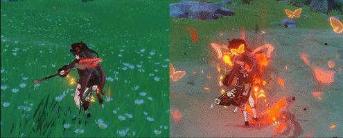 开启「蝶引来生」后的重击输出是胡桃的主要输出来源之一,而胡桃的重击在普通状态和「彼岸蝶舞」状态下有不同的动作行为。「彼岸蝶舞」状态下的重击循环大幅度的减少了普攻到重击的过渡时间以及重击后再次发起普攻的后摇时间。