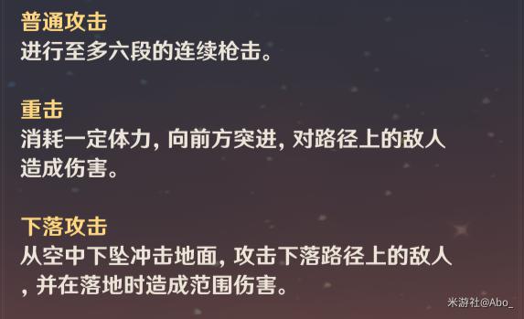 普通攻击共造成六段连续枪击,重击则会向前突刺一段距离,如动图: