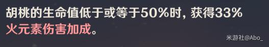 当胡桃自身生命值低于或等于50%时,可以获得33%的火元素伤害加成,胡桃突破增加的是暴击伤害,元素战技提高自身攻击力,所以对胡桃而言收益最大的就是火元素加成伤害,但是缺点就是胡桃在面对群怪使用安神秘法时几乎吃不到这个加成,需要再次释放蝶引来生控血至半血以下来吃这个加成