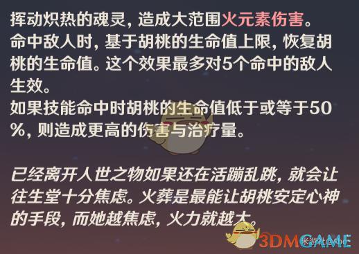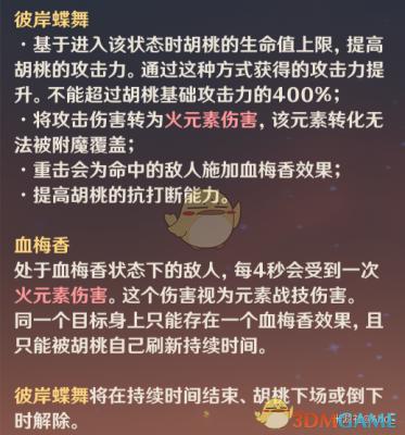 消耗30%当前生命值获取基于胡桃最大生命值的一定比例提高胡桃的攻击力,普攻和重击会变成火附魔并且不能被覆盖,重击时会额外给敌人附加血梅香效果,增加自身抗打断能力,并且重击会变得非常丝滑!如动图: