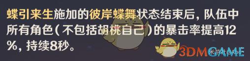 胡桃的元素战技状态结束时,队伍中其他角色暴击率提高12%,对胡桃自身没有提升,可以通过手动取消这个状态(切换角色)来提升其他角色的暴击率,由于暴击率提升比较罕见而且实用,泛用性较强