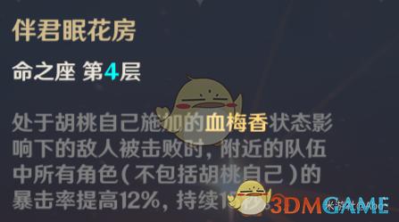 处于血梅香状态下的敌人被击败会增加队伍中所有角色12%暴击率,配合固有天赋I共能为队伍增加24%的暴击率。由于胡桃元素战技存在七秒真空期,所以胡桃是非常适合组建一支以胡桃为核心的速切阵容。在胡桃7秒真空期时四命能为队伍提供24%的暴击率进行输出