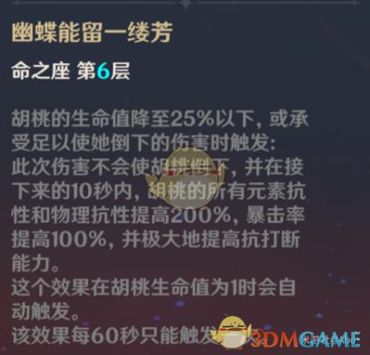 六命效果触发时能提高100%的暴击率和200%的所有抗性,200%的抗性大概为90%的减伤,所以此时的胡桃并非是无敌状态,依旧存在会暴毙的情况,在效果触发期间直接提瓦特输出天花板,效果六十秒只能触发一次,持续十秒