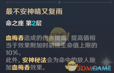 增加胡桃血梅香的伤害以及大招会额外给敌人施加血梅香,以正常拉满胡桃为例血梅香单次提升伤害约为3300