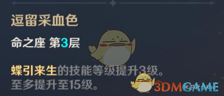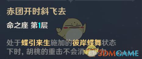 胡桃核心命座之一,开启元素战技期间胡桃的重击不会消耗体力,胡桃重击消耗体力25点,在元素战技期间共可释放八次重击,共消耗200点体力,同时重击期间会存在一定程度上通过闪避来调整视角的情况,在一定情况下会压制后续的闪避次数或者不能全程重击,在拥有一命之后即可在蝶引来生期间安心释放重击