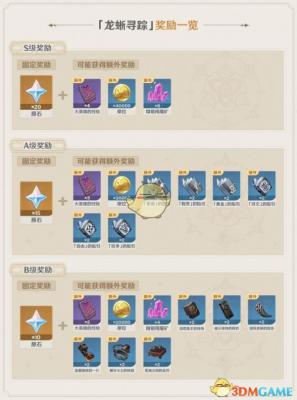 伴随着胡桃上线,新的活动龙蜥寻踪也出来了,活动奖励分为S,A,B三个等级,完成任务可以获得不同奖励,原石,经验书,金币,天赋材料,武器升级材料。乍一看不了解活动详情的玩家很可能都选择了S级别奖励,其实综合分析可以得出S级奖励并非最优解。