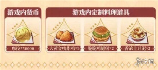 摩拉*30000、打黄金吮指鸡*1、脆脆鸡腿堡*2、香浓土豆泥*2