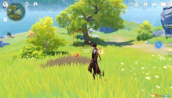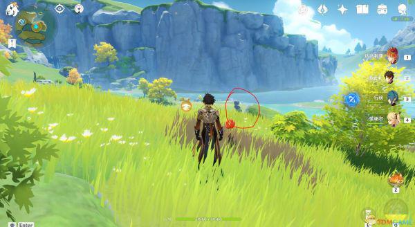 1、进入探索区域,找到烈焰花,看到树边的石柱了吗,红圈里就是。