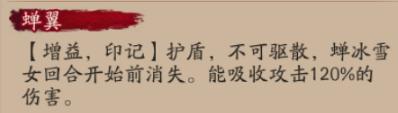 【增益,印记】护盾,不可驱散,蝉冰雪女回合开始前消失。能吸收攻击120%的伤害。