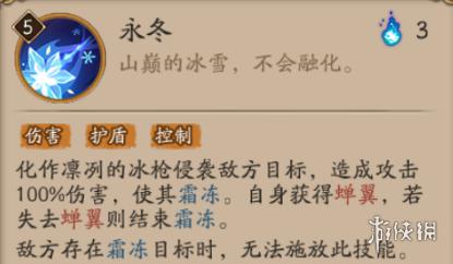 化作凛冽的冰枪侵袭敌方目标,造成攻击100%伤害,使其霜冻。自身获得蝉翼,若失去蝉翼则结束霜冻。