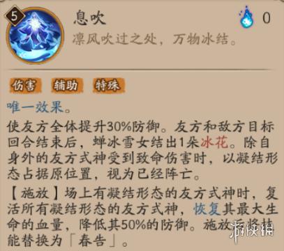 友方和敌方目标回合结束后,蝉冰雪女结出1朵冰花。除自身外的友方式神受到致命伤害时,以凝结形态占据原位置,视为已经阵亡。