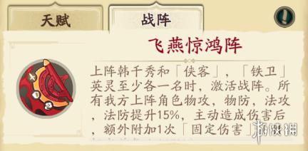 改版后的阵法【飞燕惊鸿】只需要一个铁卫一个侠客,都比较常规,很容易触发。