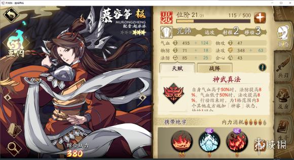 6星天赋效果【神武真法】:自身气血高于50%时,法防提高15%。气血低于50%时,法攻提高15%。行动结束时,为2格范围内4个其他友方施加「神睿」状态,持续1回合。「神睿」:物攻,法攻提高20%。