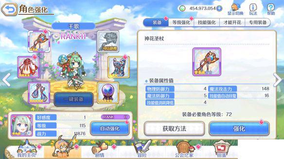 圣千除右上外,其余全部装备,左上强化三星,左中强化四星,右中强化三星,左下右下强化五星,技能状态全部拉满,等级暂时保留115级,好感度可拉满8级。