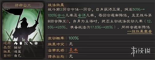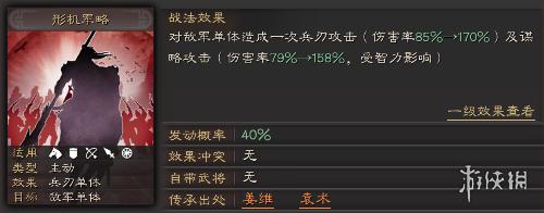 一看就知道,这是S战法版的屠几上肉。作为一个40%几率的瞬发主动,170%+158%的伤害率相当之高,但仅适合武力、智力同时很高的武将。比如这里的袁术,以及姜维等武将,都跟它比较适配。