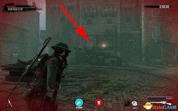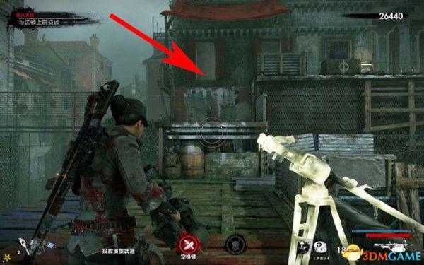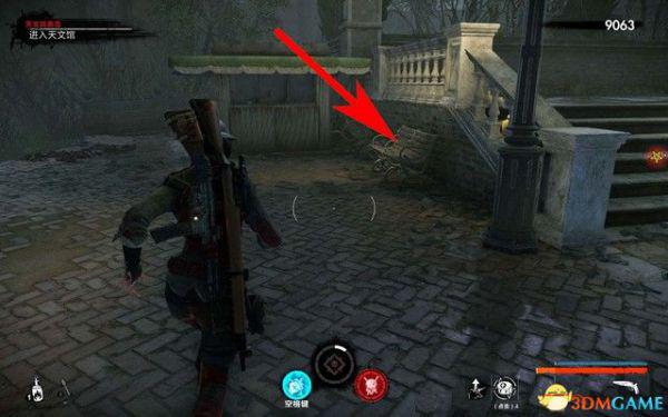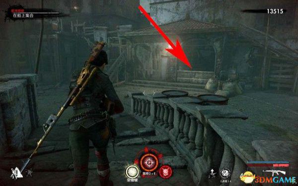 而右侧有断裂的栏杆,靠近这里,按E跳过去,如下图箭头所指,
