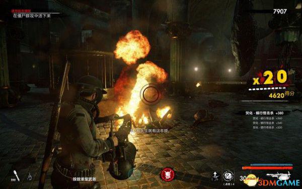 拾取BOSS掉落的喷火器,这种武器射程远,火焰可以迅速将大群僵尸吞噬。