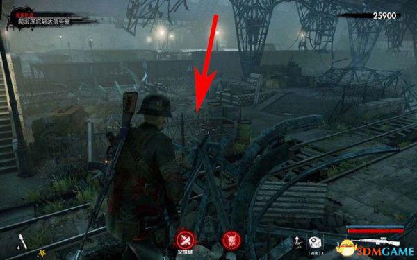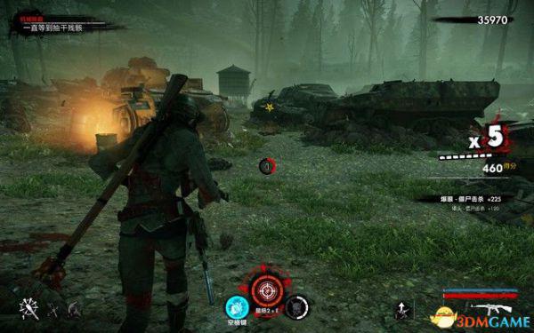 穿过火车残骸,上坡,这里的僵尸可以用重武器击杀,一枪一个。