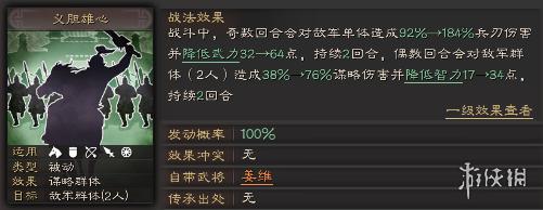 姜维的自带战法是个典型的被动输出战法,就战法总伤害来说,可以与司马懿媲美。同时自带武力、智力的削弱效果,并且从首回合就开始对敌方有持续性的伤害施压,因此不论从伤害上、还是团队增益上讲,都是十分不错的。
