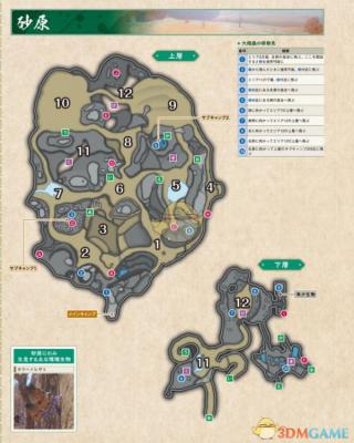 《怪物猎人:崛起》砂原是大沙漠地图,里面全是黄沙和岩石,里面的生物也充满着一股粗犷的感觉。不过砂原的地图还挺大的,能采集的东西也不少,下面我们来看看砂原的详细地图吧