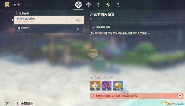《原神》中给芙萝拉留影需要玩家先于她对话,然后才能留影,不然不礼貌。然后如果出现下图的情况,那么就需要玩家先去做风花于雪花这个任务,不然这个角色会被占用,没有办法拍照。
