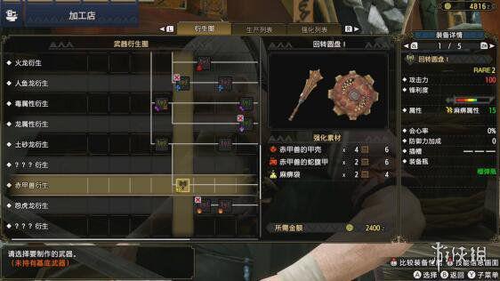 之后打到土砂龙和赤甲兽,可以将毒属性衍生盾斧回溯重新打造为赤甲盾斧,麻币可以增加一两次电锯站桩输出的机会。