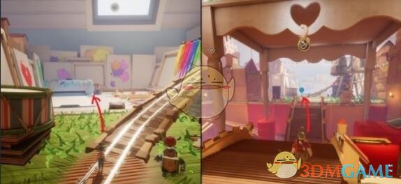 小节开始后穿过城堡门前往右手边。在尽头你会看到一些颜料和一台打印机,跳到打印机后背的旋转处被压扁即可。