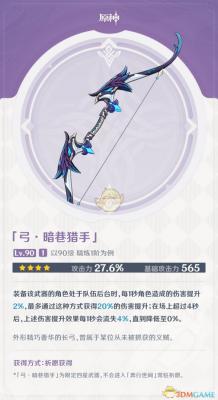 暗巷猎手是《原神》1.4版本新推出的一把四星弓,这把弓90级基础面板565,副属性增加27.6%的攻击力。后台增伤1精炼情况下提升20%,满精炼情况下提升40%。站场4秒后会逐渐流失伤害,直到加成消失。