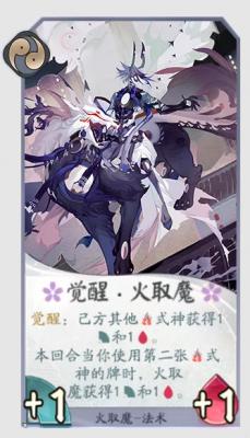 觉醒·火取魔可以使己方其他红莲式神+1/+1,对于红莲派系阵容来说是很优秀的提升。身材加成也能配合到火取魔自身的多张卡牌。