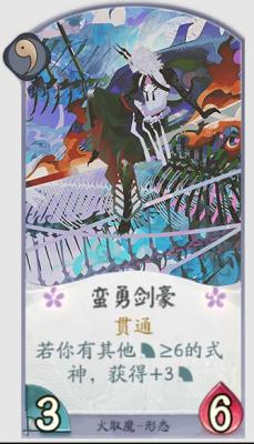 蛮勇剑豪有机会在一勾玉阶段就达到6-6身材的形态牌,搭配茨木童子的豪拳可以轻松达到增强效果,形成双重压制。