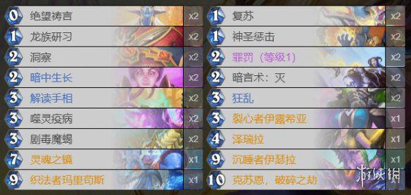 和上面那套牧师有一些小的区别,带上了剑圣+神圣化身的buff,而且吸血buff在面对恶魔猎手的时候表现更好。我觉得这套牧师比上面那套强的地方在于二费曲线更满,魔杖工匠可以帮牧师前期混一混,赛泰克织巢者既可以前期扔上去断对手节奏也可以中期补一波手牌资源,因为前期小生物更多,亡者复生也可以创造更多价值,这套牧师如果起手顺前期可以保证一直在上怪靠场面混一混来节约解牌。后期的制胜点两套牧师都选择了克苏恩+伊瑟拉。(事实上现在牧师的龙族研习质量非常高了,自己带伊瑟拉很多时候还是为了稳定拿到一费的闷棍和那张aoe)