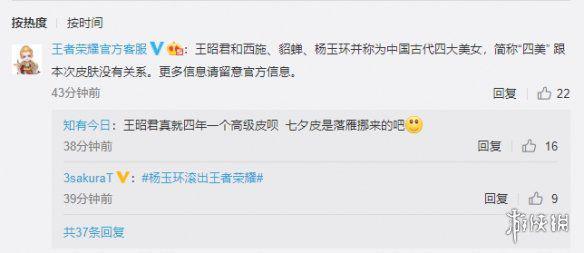 接着5:19分的时候在诗雨江南皮肤的预告片下方的回复中,回复玩家:王昭君和西施、貂蝉、杨玉环并称为中国古代四大美女,简称“四美” 跟本次皮肤没有关系。更多信息请留意官方信息。