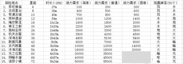 解神者中许多萌新不知道探险功能中,在哪里收益比较高,结晶掉落分别是什么,探险的战力需求是什么样的。下面小编就给就给大家带来一张探险需求与结晶掉落的表格,有小伙伴需要的就看看吧。