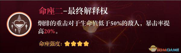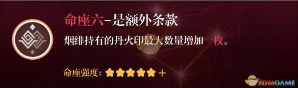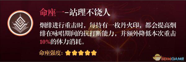 质变命座。烟绯的天赋和技能命座就是围绕“丹火印-重击“体系构建的,+1丹火印上限意味着更高的重击倍率,更多的火伤加成,更强的抗打断能力和更少的体力消耗。每一项都不多但是综合起来提升就很可观了。
