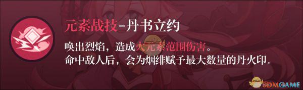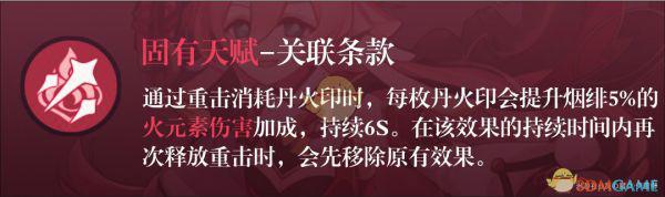 烟绯的”丹火印-重击“体系里的一环,可以视为常驻提供15%的火元素伤害加成,是一个不错的进攻天赋。(自带魔女二件套好吧),6命多一枚丹火印上限则是20%。