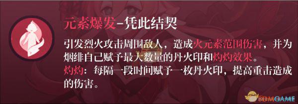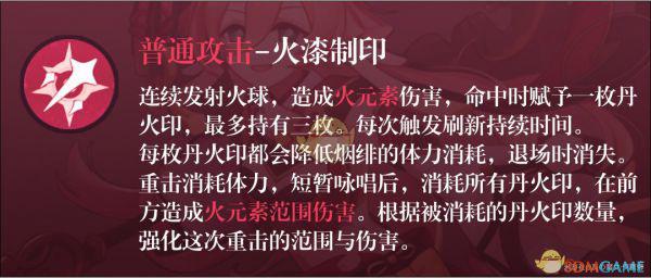 PS:烟绯在普攻命中敌人后才会获取丹火印,实战中如果敌人距离烟绯较远,且普攻和重击之间间隔很短的情况下是会发生重击没有吃到满层丹火印的情况的。这种时候请稍微放慢一下重击的衔接速度即可。