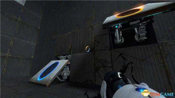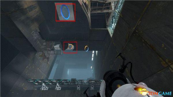 再次射击对面的墙壁,然后从身后的橙色传送门进去,到达对面的蓝色传送门。