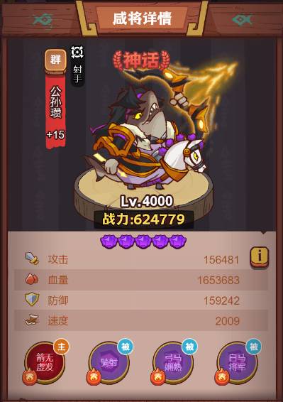 咸将技能:公孙瓒的主动技能可以对后排敌人造成300%攻击伤害,击碎目标30%护盾,同时自身获得一个50%自身攻击力的护盾。这样不仅有较高的伤害还可以对增加自身的坦度,那么配合着公孙瓒这个主力,剩下的一些搭配可以安排输出加回血的挂件就可以了。