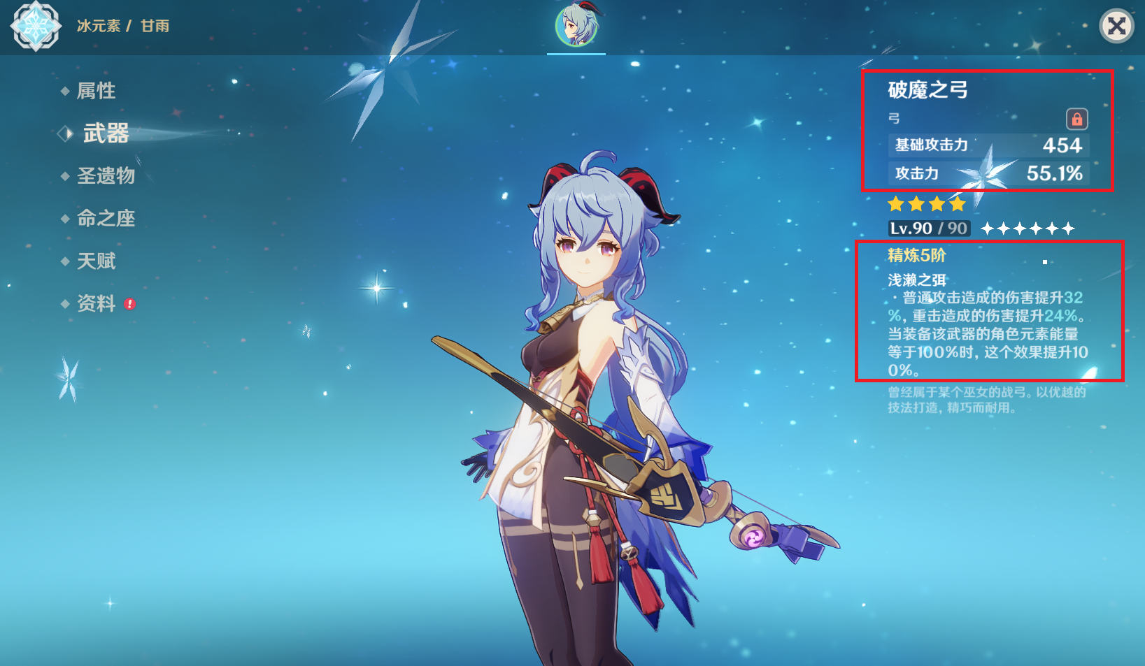 最后是武器的选择,之所以放在最后说,是因为不管你的甘雨走的是“永冻流”还是“融化流”,武器都可以选择一样的。有条件的小伙伴可以选择5星武器,优先级别为阿莫斯之弓>天空之翼>飞雷之震弦,不推荐冬极白星和终末嗟叹之诗。普通玩家就更好选择了,只有破魔之弓这一把4星武器,试作澹月是不推荐的,这以前花郎也说过,怪物弱点不明显了,试作澹月这件武器基本算是废了。