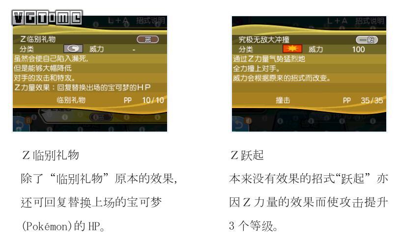 变化招式→变化 Z 招式,变化招式会借由Z力量得到增强,已有的效果将会得到强化,同时也有可能会追加新的效果。