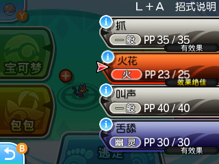 不过在本作中,玩家如果对战此前已经相遇过的宝可梦,那么招式的效果是会直接显示在旁边的,其描述分别对应: