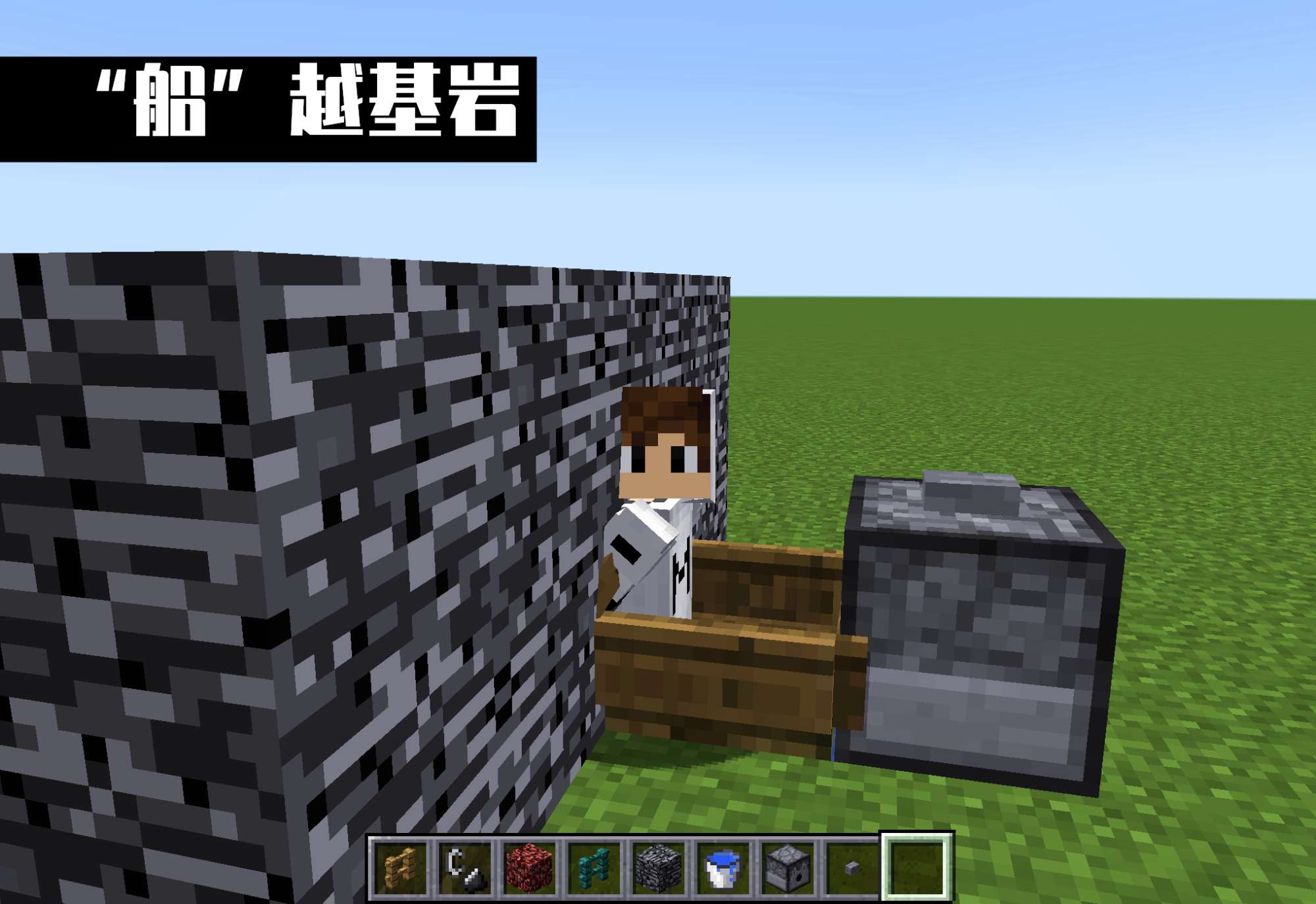 是的你没看错!这不是错别字,意思就是用“船”来穿越基岩。理论上基岩是不可破,同时也是不可穿越的。《我的世界》版本更新至今,已经封堵了绝大多数的穿越基岩的方法,包括最为传统的矿车卡基岩。