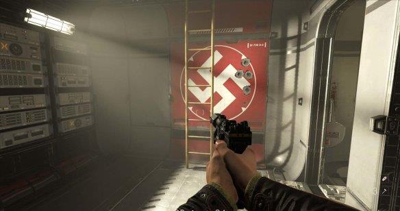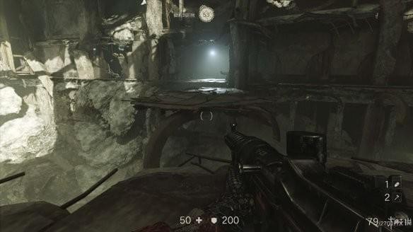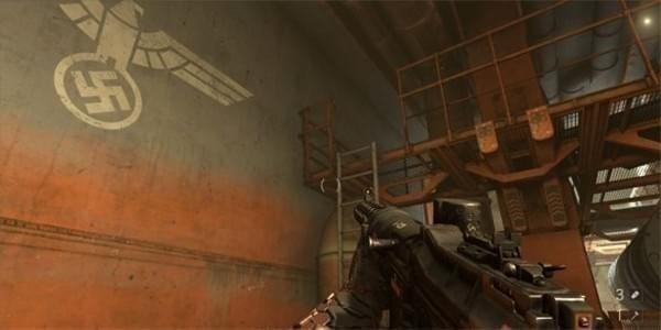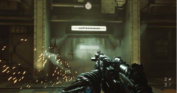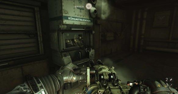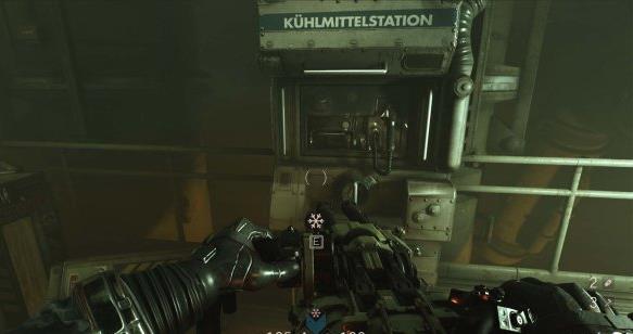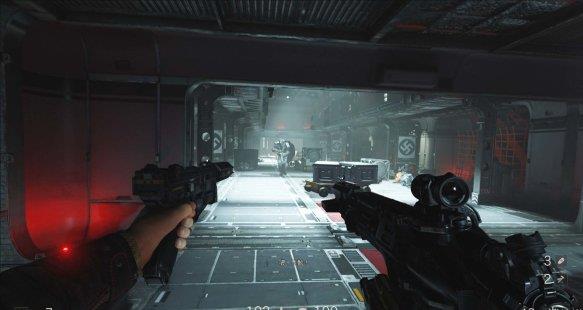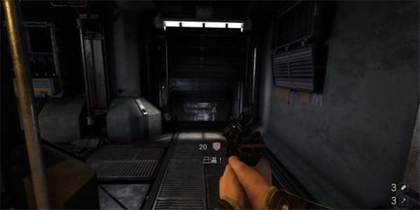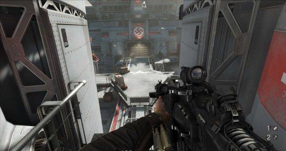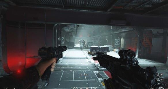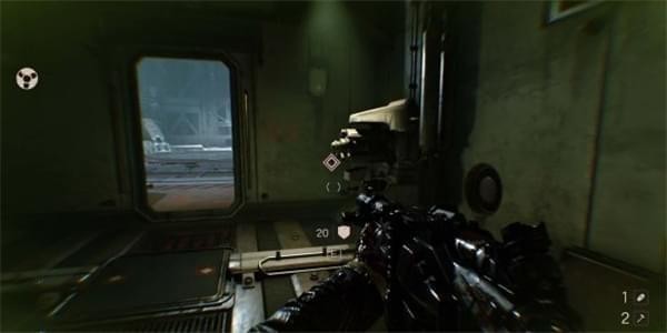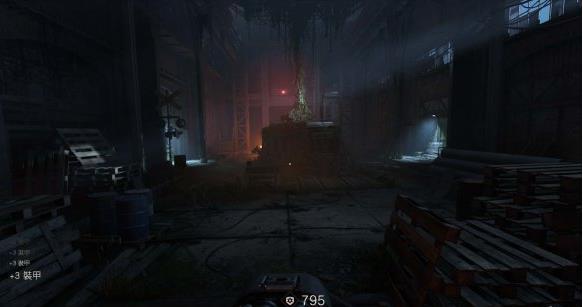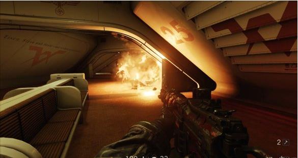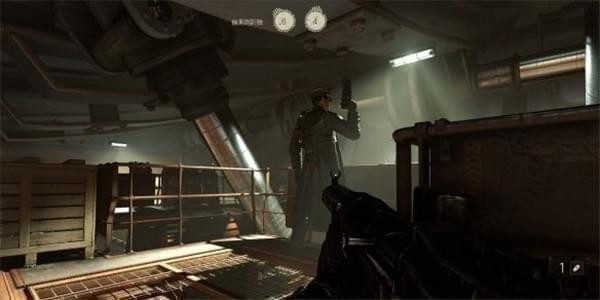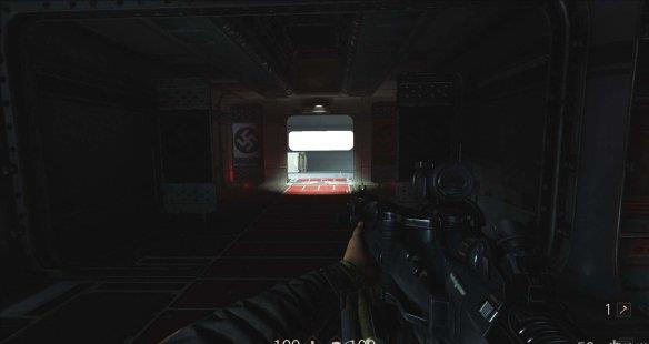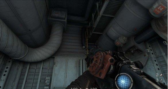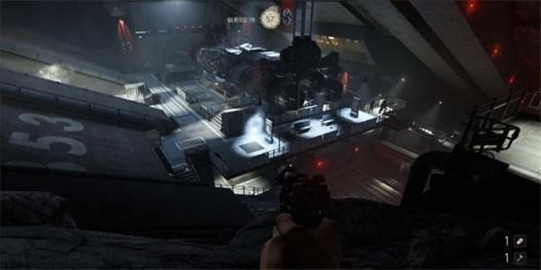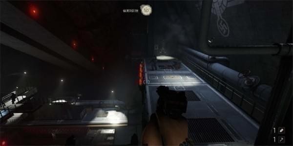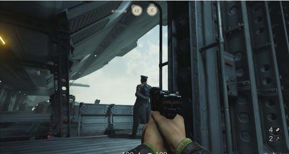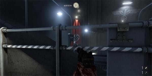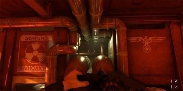 从通风管道出来发现有不少纳粹士兵,从对话中得知一大群纳粹士兵已经在F区多了好几个月。这里可以选择一路暗杀过去。途中有可以给雷射枪充能的装置,充能装置旁的地板可以破坏。