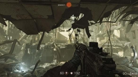 切断后房子继续塌落,B.J掉了下去,往里走跳上如图位置的台阶,在台阶有个出口,来到外面切断另一个钳爪。