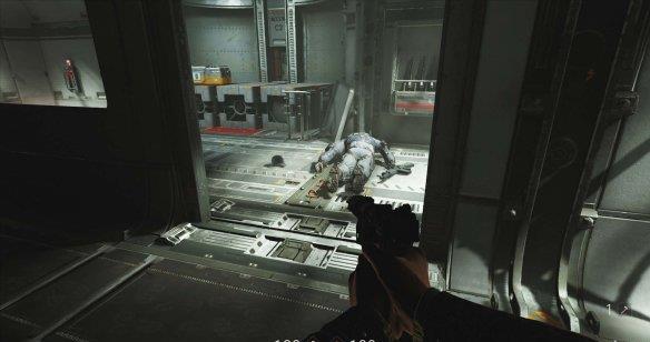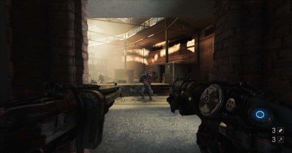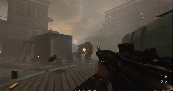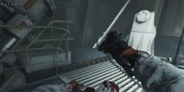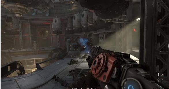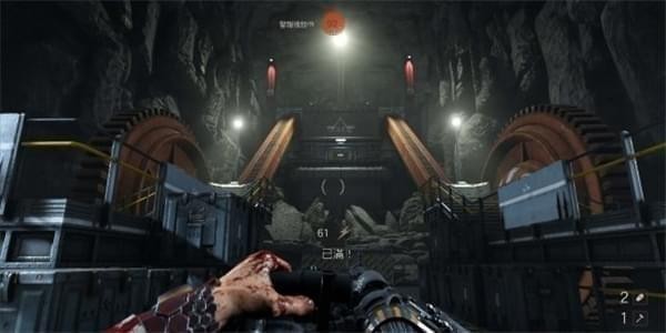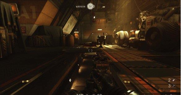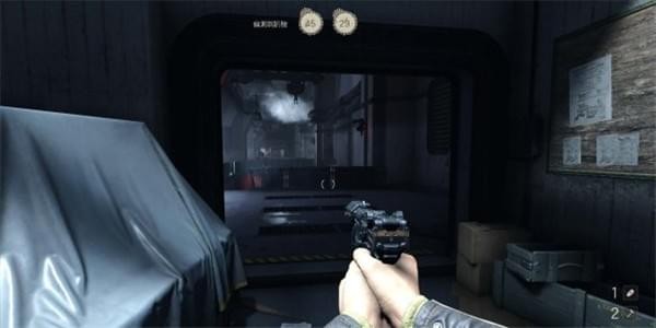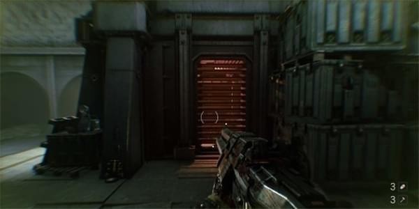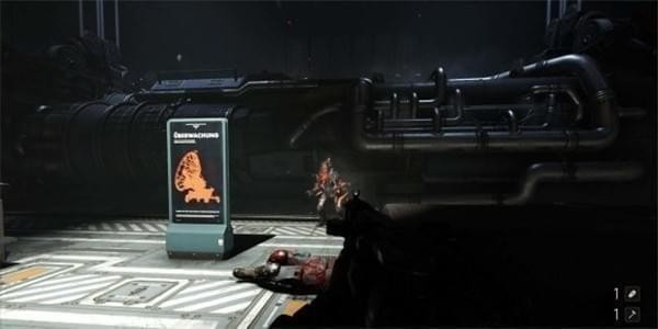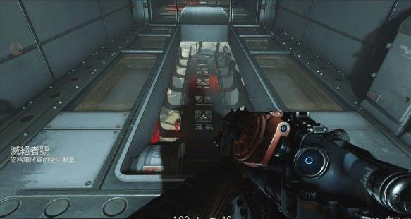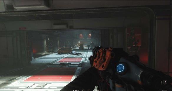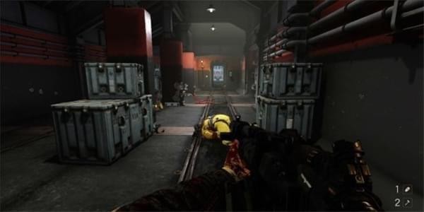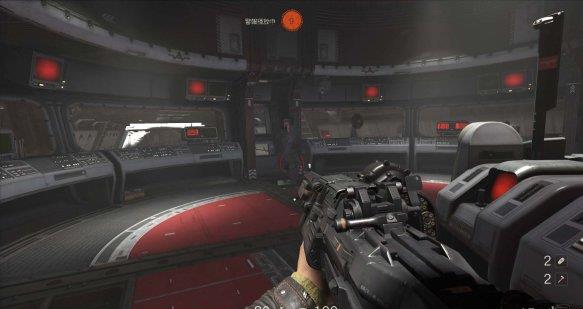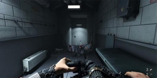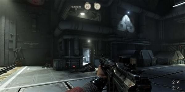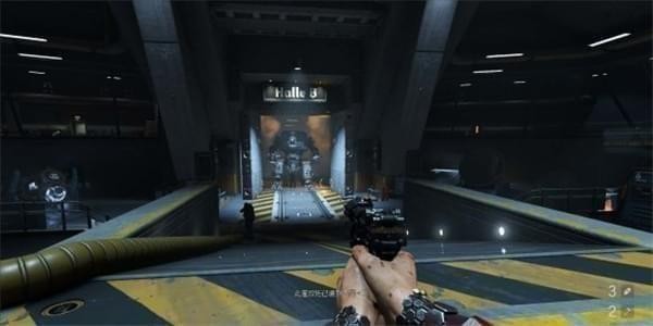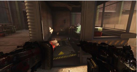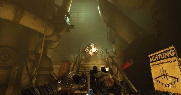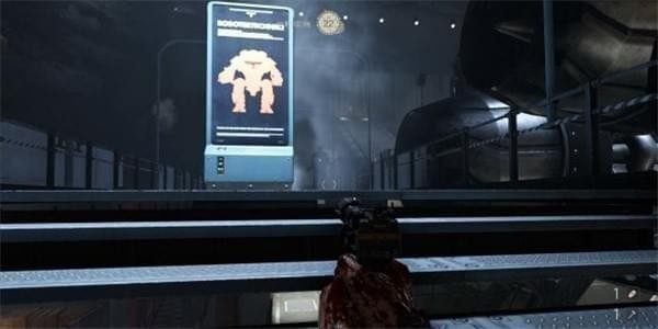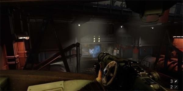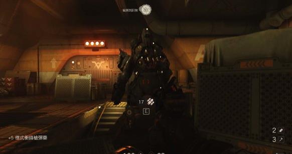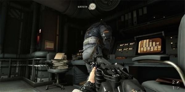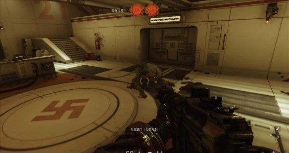 来到科研室解决,纳粹科学家们后继续前进。沿途有还未启动的机甲兵,可以下蹲靠近用近战攻击解决几个。