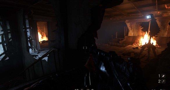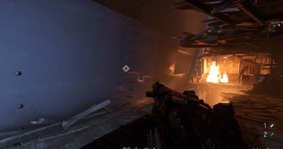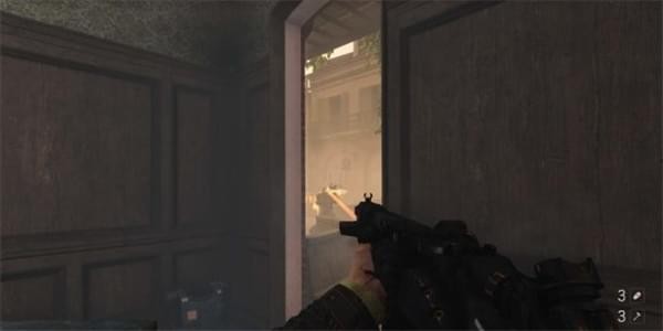消灭前来搜查的纳粹士兵后往前走,可以看到道路被一辆着火的公交车挡住。进入左边的房子,出门有纳粹士兵,可以躲在房内偷袭。